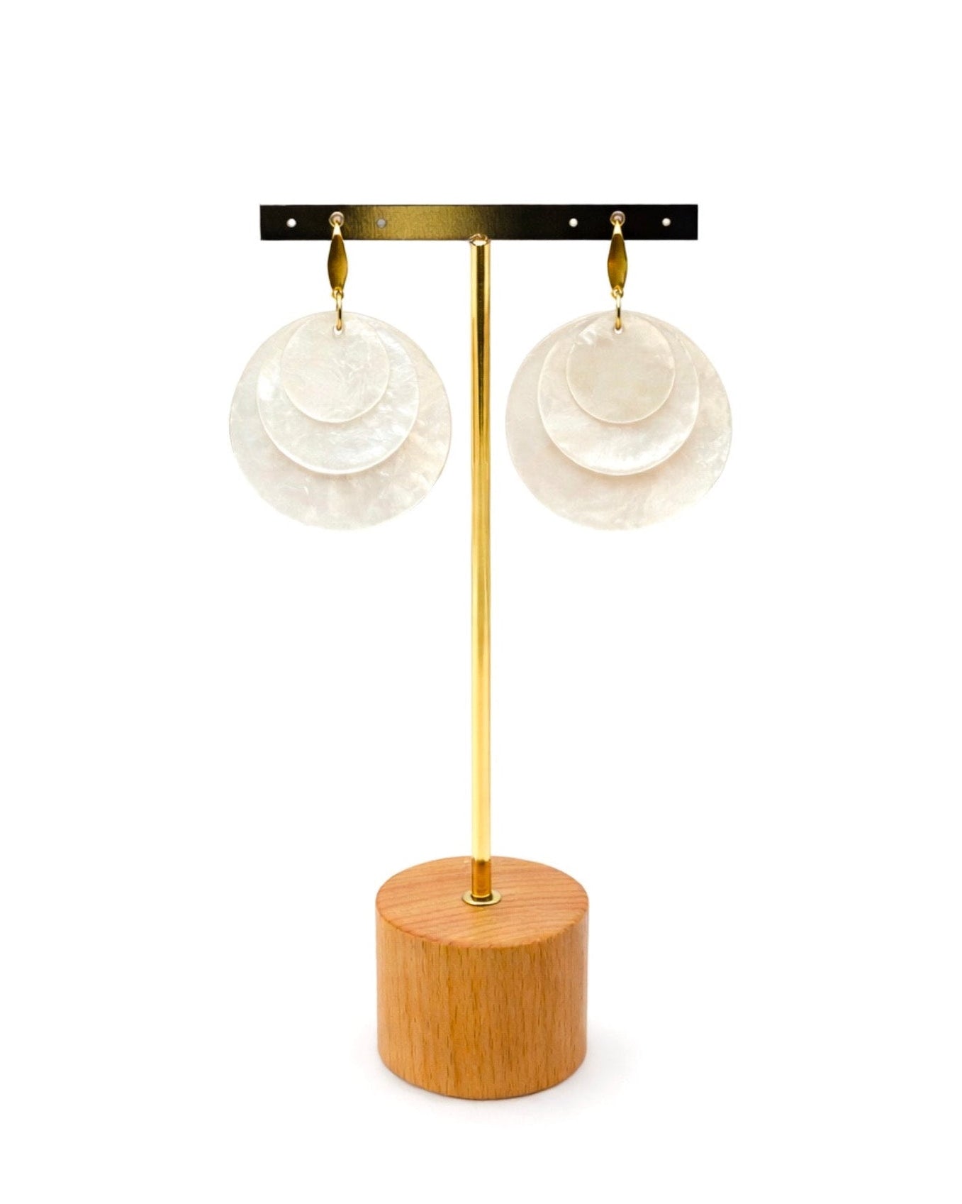 Pendientes hechos a mano de forma artesanal en España con piezas de acero inoxidable y nácar.